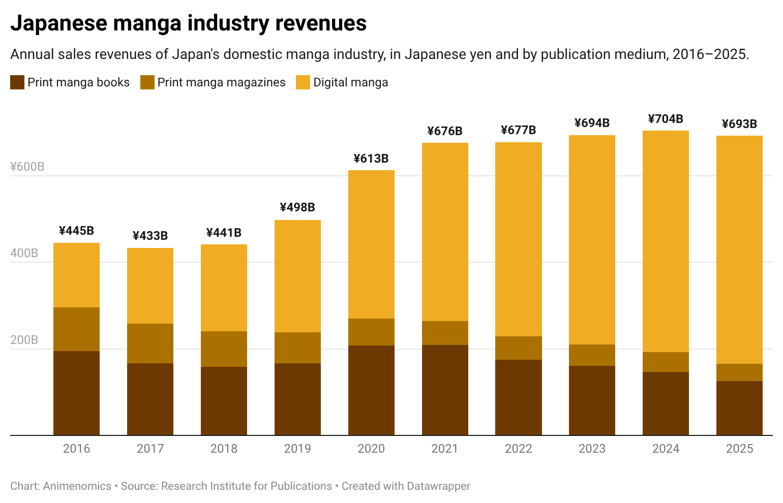 By the numbers: The domestic manga market shrank by 1.7 percent to an estimated ¥693 billion (US$4.45 billion).